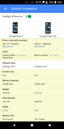 هم اکنون برای برخی از کاربران امکان مقایسهی دو دستگاه با قرار دادن عبارت vs در وسط نام دستگاهها (برای مثال، Pixel 2 vs Pixel 2 XL) فراهم شده است و تفاوت میان دو دستگاه جستجو شده در قالب یک جدول به کاربر ارائه میشود. در نتایج، چند ردیف اصلی نمایش داده میشود که کاربر می تواند با کلیک کردن به روی گزینهی آبی رنگ تمامی جزئیات رامشاهده نماید.